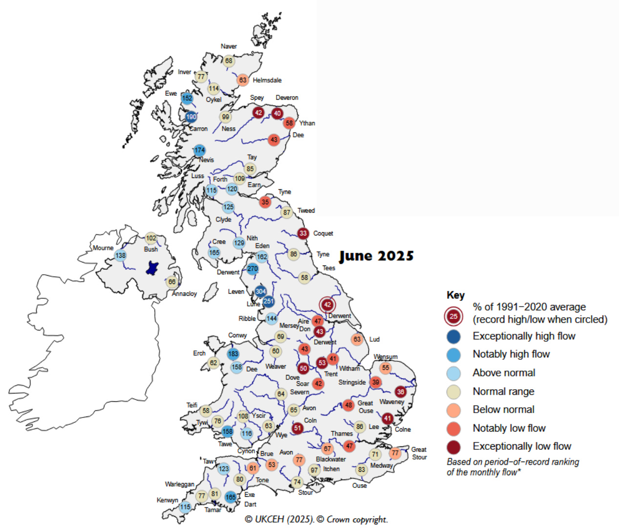 At the end of June, according to the latest hydrological report, there was a marked difference in river flows across the UK - shown below.